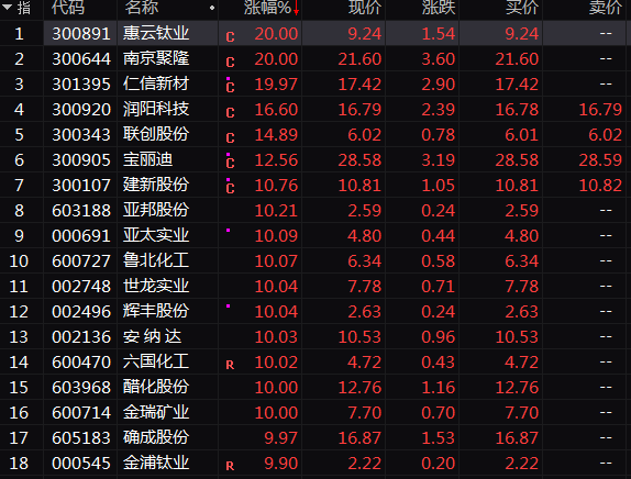 化工股今日掀涨停潮,惠云钛业(300891)、南京聚隆(300644)、仁信新材(301395)等多股直线20%涨停;亚太实则一字涨停,连续第4日封板;鲁北化工(600727)、世龙实业(002748)、六国化工(600470)、辉丰股份(002496)等近20股涨停或涨超10%。