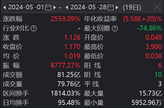 谁知一声惊雷,在消息面没有任何利好的情况下,5月13日-5月17日一周之内,法拉第未来的股价从0.048美元/股涨到最高3.9美元/股,振幅达到8380%。即使算上近一周的回调,截至5月28日美股收盘,5月法拉第未来的股价涨幅超过2500%。