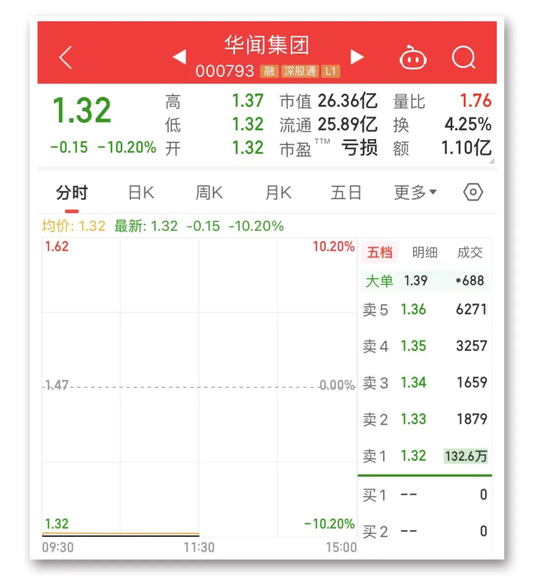今天上午,华闻集团(000793)开盘仅几秒钟的时间,股价就跌停。上午收盘,跌停板上仍有近133万手大单,最新收盘价为1.32元。此前,该股连续8个交易日收出7个涨停板。