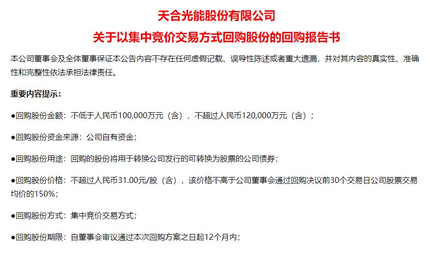 6月25日晚间,全球光伏组件龙头、A股公司天合光能公告,拟以10亿元-12亿元回购公司股份,回购股份将全部用于转换公司发行的可转换为股票的公司债券。此次回购价格不超过31元/股。