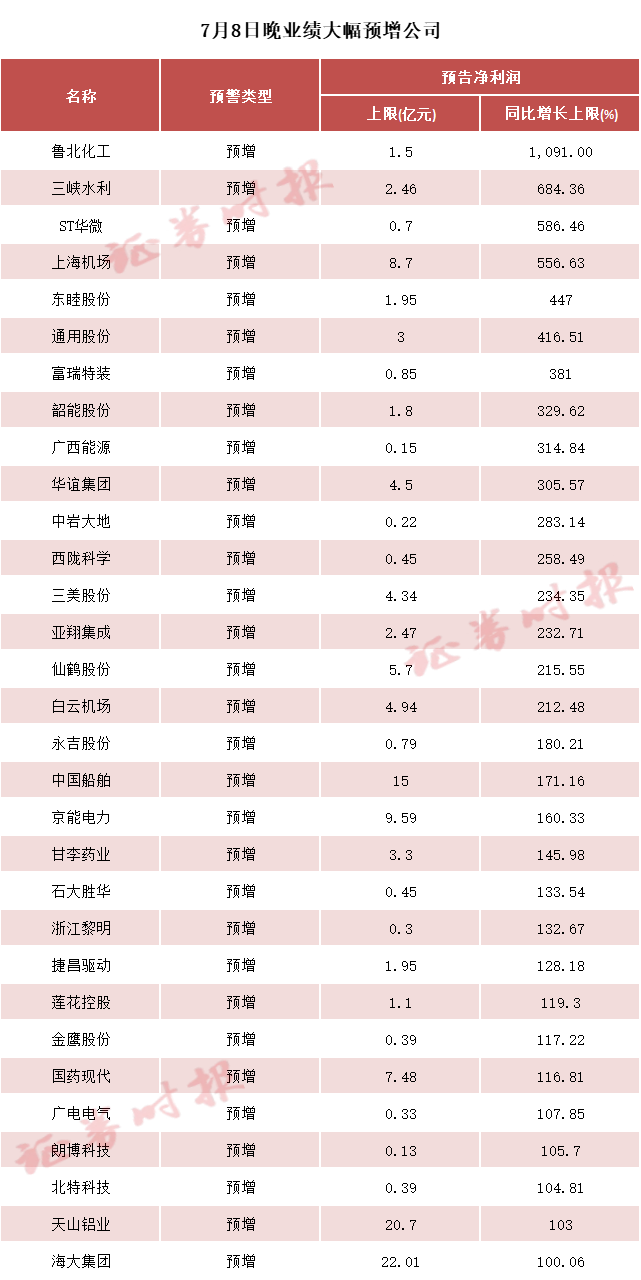 根据7月8日晚A股上市公司披露的半年报预告,鲁北化工、三峡水利(600116)、ST华微(600360)、上海机场(600009)等多家上市公司预计今年上半年业绩同比最高实现翻倍。