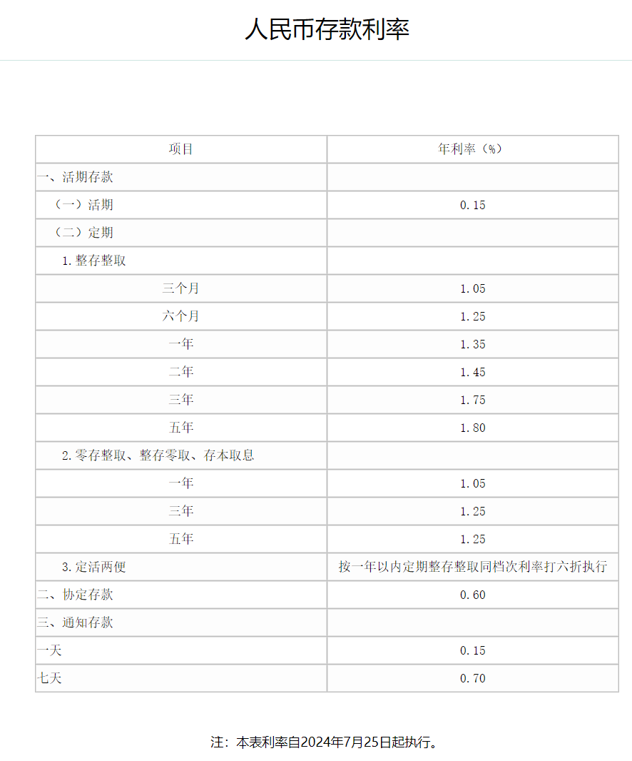 此外,中国农业银行(601288)官网显示,农行于7月25日下调了人民币存款利率,其中定期整存整取三个月、半年期、一年期利率均下调10个基点,分别为1.05%、1.25%、1.35%;二年期、三年期、五年期利率分别下调20个基点,至1.45%、1.75%、1.80%。零存整取、整存零取、存本取息利率下调10个基点,通知存款挂牌利率下调10个基点。