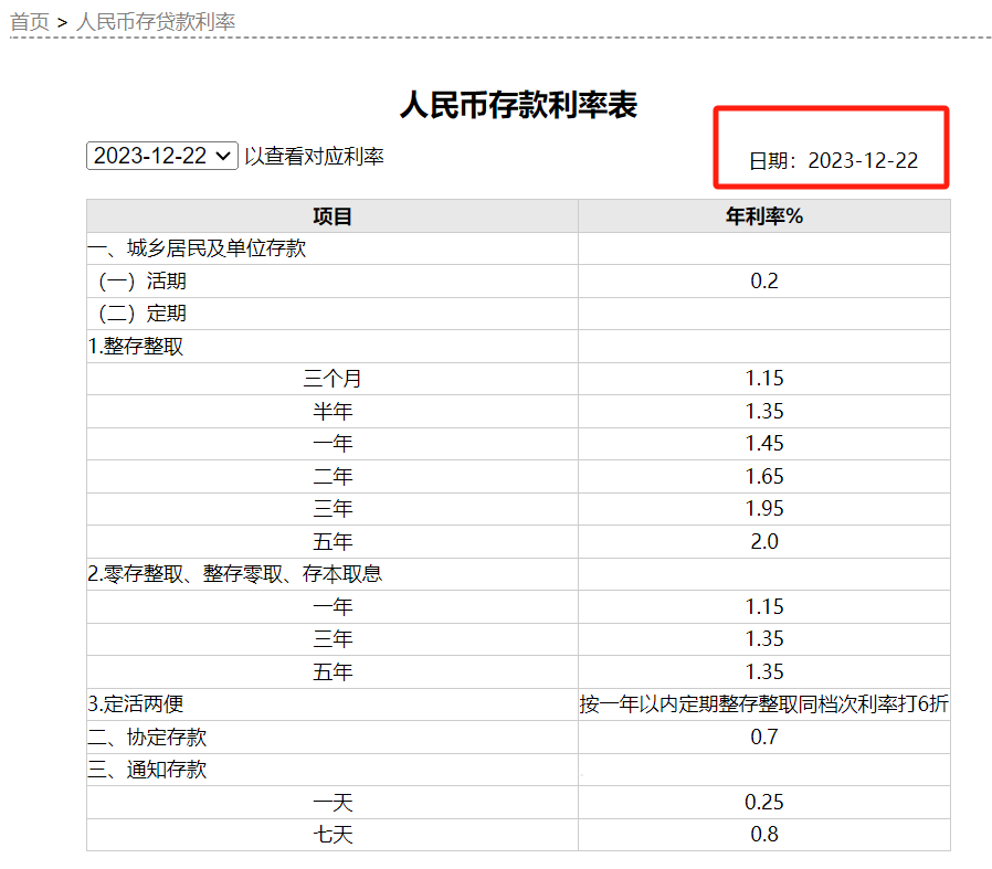 工行官网显示,上一次挂牌利率调整是在2023年12月22日,其中活期利率0.2%,三个月为1.15%、半年为1.35%、一年为1.45%、二年为1.65%、三年为1.95%、五年为2.0%。