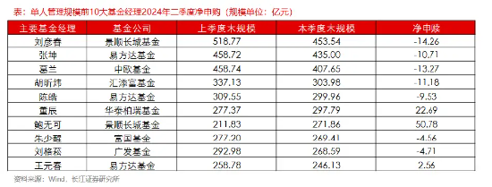 单人管理规模前10大基金经理2024年二季度规模缩水147.18亿,其中净申购7.81亿,上季度净赎回104.87亿。
