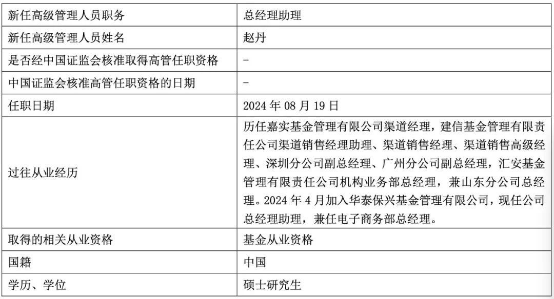同时,华泰保兴基金也公告称,赵丹升任总经理助理,兼任电子商务部总经理。