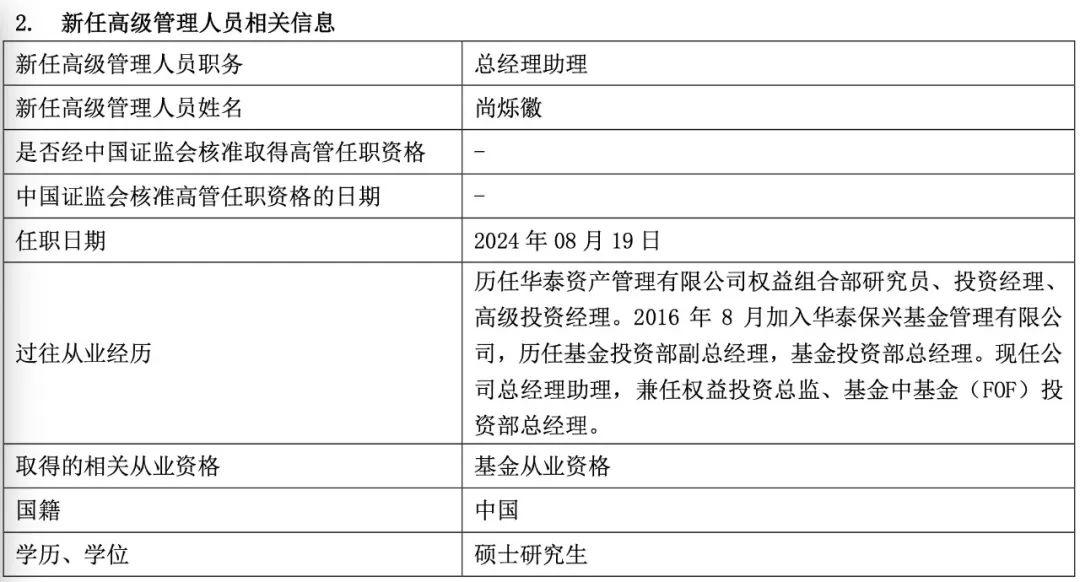 8月20日,华泰保兴基金发布公告称,基金经理尚烁徽升任公司总经理助理,兼权益投资总监、基金中基金(FOF)投资部总经理,任职日期是2024年8月19日。
