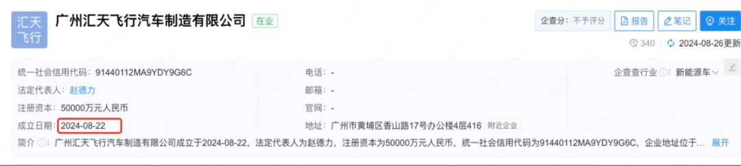 值得一提的是,该公司由广东汇天飞行汽车有限公司全资持股,广东汇天飞行汽车有限公司是8月19日才注册成立,由小鹏汽车旗下HT Flying Car(Hong Kong)Limited全资持股。