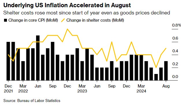由于住房和旅游价格上涨,美国八月份基本通胀意外上升,削弱了美联储下周大幅降息的可能性。